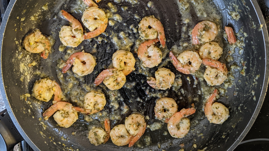 - Heat olive oil in a heavy skillet over high heat until it just begins to smoke. Place shrimp in an even layer on the bottom of the pan and cook for 1 minute without stirring.